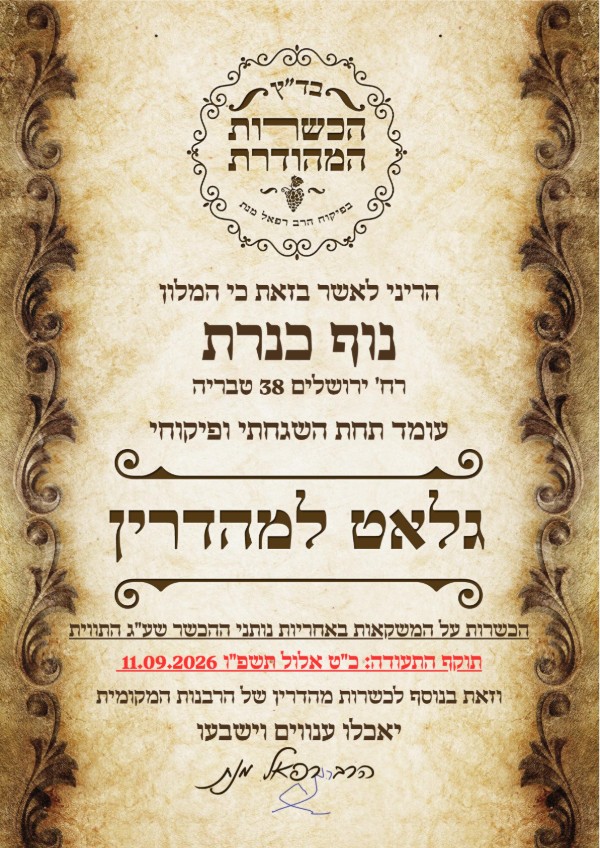 לקבוצות בלבד: קבוצות המעוניינות בכשרות מהודרת ספציפית, יש לתאם מראש בעת סגירת ההזמנה